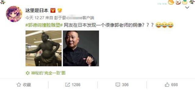 “日本网民发现了一尊像郭老师的铜像?文后,作者配发了两幅图片,一副是与郭德纲铜像相似的图片,另一幅是郭德纲本人,。