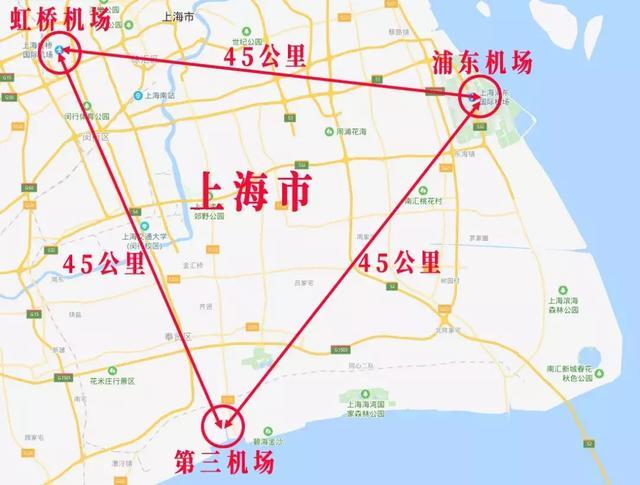 三是能带动上海相对欠发达的南部郊区发展,正好和虹桥、浦东形成边长都是45公里的等边三角形。