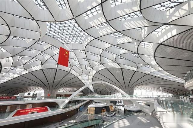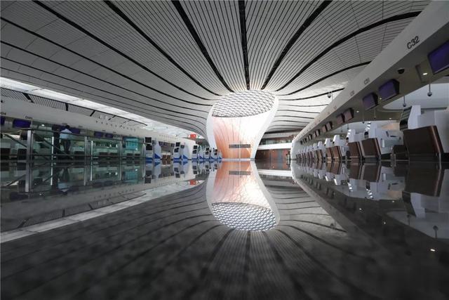 机场航站楼内主色调为白色,C形柱与屋顶装饰板等形成梦幻般的高大空间。屋盖面积达18万平方米,主要以8根上宽下窄的C型柱及周边12根塔柱等支撑,头顶大面积天窗引入通透的采光。