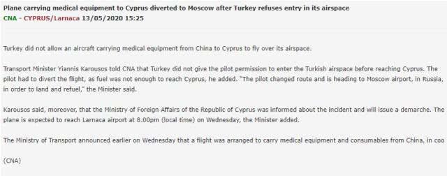 据俄塔社13日报道,塞浦路斯通讯社(CNA)周三发消息称,塞浦路斯交通通信与工程部部长扬尼斯·卡鲁索斯称,一架从中国起飞飞往塞浦路斯运送抗疫医疗物资的飞机,临时改航前往莫斯科,这是因为土耳其拒绝让这架飞机飞越其领空。