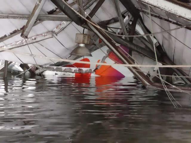 这是那架被砸毁的比奇400型飞机,机身全部泡在了水里,证明印度机场的排水系统真的很差。机身被垮塌的机库给彻底砸毁,不具备修复的可能和价值了。