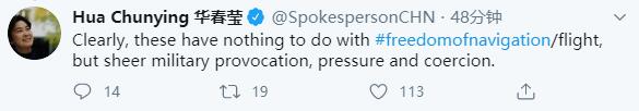 华春莹写道:“显然,这些(行为)与所谓的自由航行无关,而是纯粹的军事挑衅、军事施压和军事胁迫。”