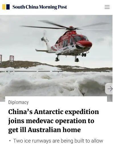 报道称,在当下中美澳三国地缘政治关系紧张的情况下,三国的科考队在南极却合作起来,救助一名患病的澳洲科考队员。澳大利亚南极项目的一位负责人金埃利斯周一表示,他们正在修建两条单独的冰跑道,作为此次救援行动的一部分,目的是将这名得病的澳洲科考队员从位于南极的澳大利亚戴维斯科考站运送回澳大利亚。但这次医疗撤离过程要依赖于中国和美国在南极项目的航空支持。