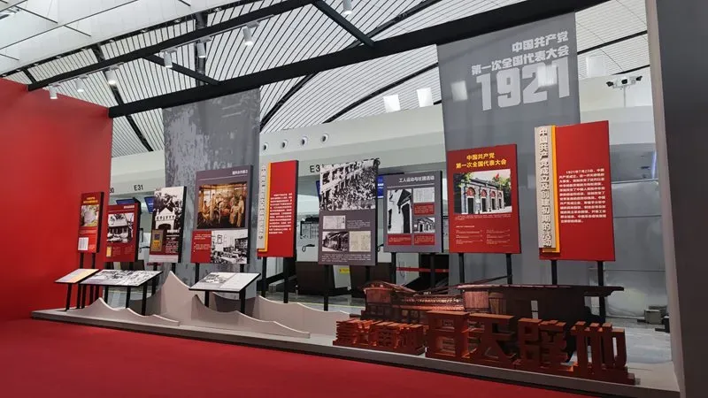 此次推出的红色主题展览及景观设置,是大兴机场打造人文机场的又一次创新尝试,为营造庆祝中国共产党成立一百周年的红色主题氛围,以历史展览和艺术布景的形式,表现了党史中的重要历史事件,从学习党史及展现人文机场的角度,展现了中国共产党百年奋斗历程,反映了社会方方面面变革的画面,打造了一个记录时代变迁的红色经典文化展览,让旅客在旅途中学习党史、锤炼党性、感知党情。(大兴机场:哈皓然报道)