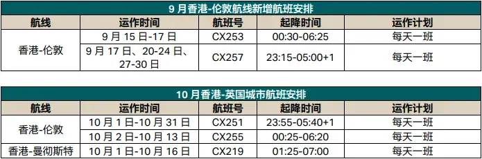 9月15日起,除每日营运CX255(00:25-06:20)及CX251(23:55-05:40+1)由香港出发前往伦敦,国泰航空还将于部分日期增加CX253(00:30-06:25)及CX257(23:15-05:00+1)航班,以满足9月下旬留学生的殷切出行需求。10月上旬,除营运每日两班前往伦敦的航班,国泰航空还将运作每日一班前往曼彻斯特的航班,以满足不同留学生的返校需求。