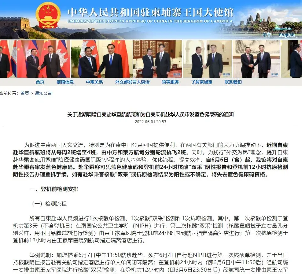中国驻柬埔寨大使馆6月1日发布:为促进中柬两国人文交流,特别是为在柬中国公民回国提供便利,在两国有关部门的大力协调推动下,近期自柬赴华直航航班将从每周2班增至4班,由中方和柬方航司分别轮流执飞2班。同时,为践行“外交为民”理念,提升自柬赴华乘客使用微信“防疫健康码国际版”小程序的人本体验,优化流程,提高效率,自6月6日(含)起,我馆将对自柬赴华乘客审发蓝色健康码。赴华乘客可凭蓝色健康码和登机前24小时核酸“双采”阴性报告和登机前12小时抗原检测阴性报告办理登机手续。如有赴华乘客核酸“双采”或抗原检测结果为阳性或不确定,将失去蓝色健康码资格。