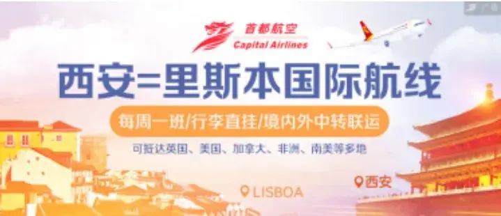 目前,首都航空采用空客A330宽体客机执飞西安=里斯本航线,每周六由西安出发,飞至葡萄牙首都里斯本;里斯本当地时间每周六出发,飞回西安。国内旅客可由上海、杭州等国内多个城市出发,经西安抵达里斯本后中转至英国、意大利、西班牙、美国、非洲等地,助力全球复学返校、复产务工。